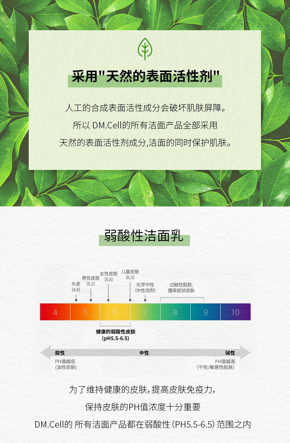 DM.Cell的 所有洁面产品都在/弱酸性(PH5.5-6.5)范围之内
