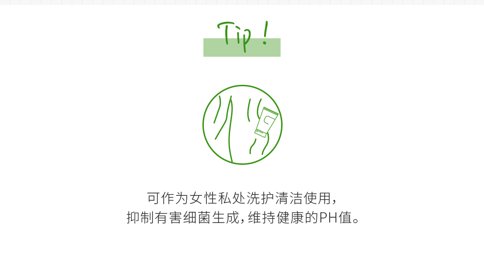 可作为女性私处洗护清洁使用,抑制有害细菌生成, 维持健康的PH值